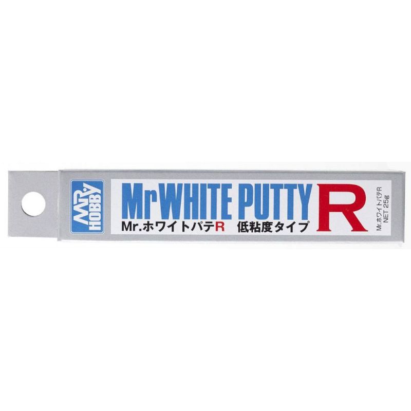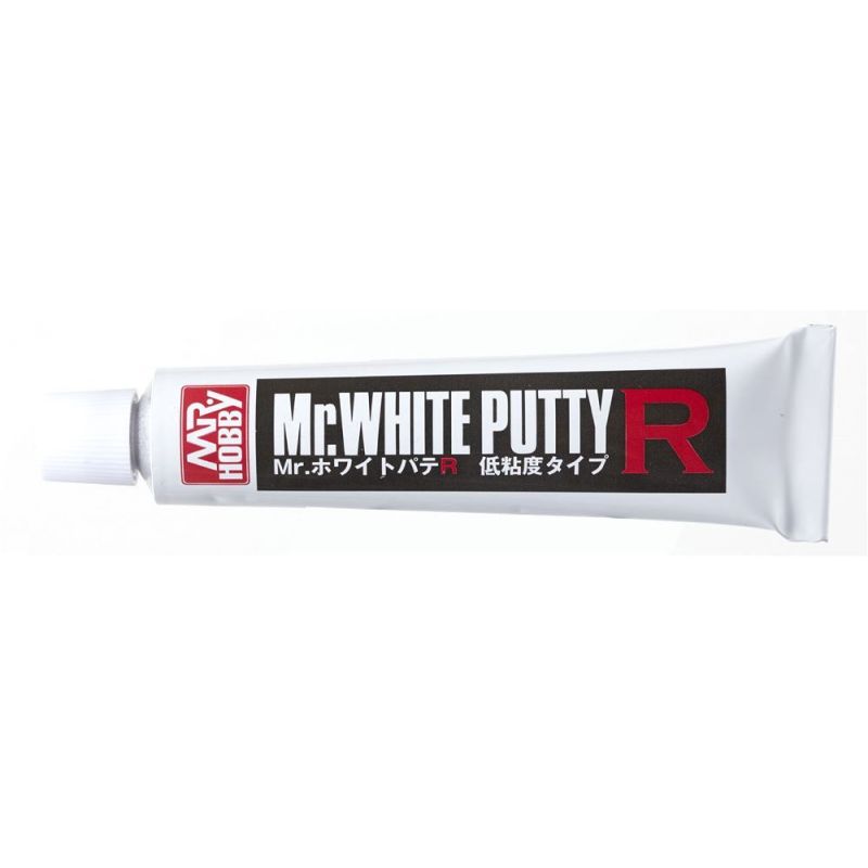 Mr White Putty R; tubo de masilla de color blanco y baja viscosidad. Debido a su bajo indice de viscosidad es especialmente apropiado para rellenar pequeñas grietas e imperfecciones. Una vez endurecido, proporciona una calidad de corte suave muy similar al material plástico del modelo original.